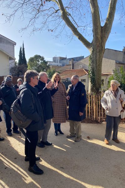 Cette visite a été l’opportunité d’apprécier la qua­li­té des amé­na­ge­ments réa­li­sés, notam­ment la mise en valeur et la pré­ser­va­tion des arbres exis­tants. Ces der­niers ont fait l’objet d’un soin par­ti­cu­lier, avec un apport de mulch pen­dant une année entière afin de nour­rir les sols, et ont été rigou­reu­se­ment pro­té­gés tout au long du chan­tier. L’a­mé­na­ge­ment du che­mi­ne­ment se veut expé­ri­men­tal, mon­té sur micro­pieux pour limi­ter l’im­pact sur le sys­tème raci­naire de ce patri­moine végé­tal classé.