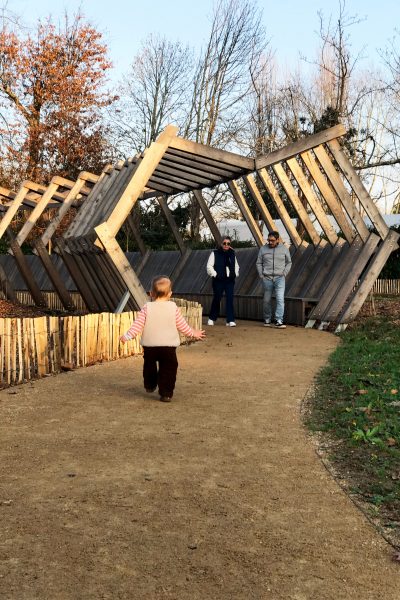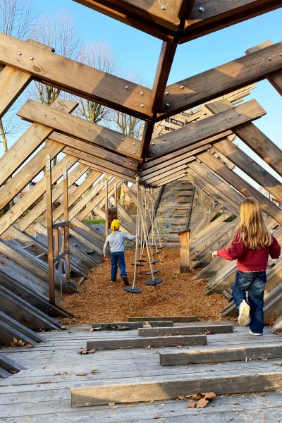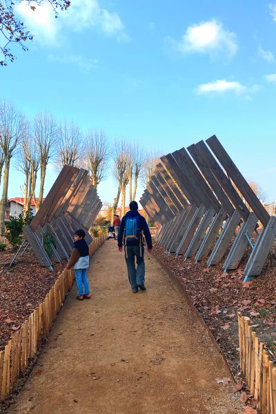 Fil conduc­teur du pro­jet, une spec­ta­cu­laire struc­ture en bois en forme de dra­gon, Sugul­na, figure mythique de la com­mune. À la fois aire de jeux, pro­me­nade, ombrière, pas­se­relle et espaces de pause, le dra­gon struc­ture les usages et accom­pagne les visi­teurs depuis le cœur du parc jusqu’à la média­thèque, puis vers le tal­weg et la balade de Liza­ga, connec­tant ain­si le site au maillage pay­sa­ger plus large de la com­mune.