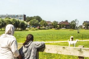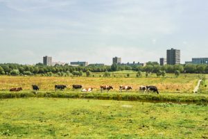 Au retour, je longe le canal de Rotte avec son ambiance rurale et ses grands ensembles en toile de fond. Les abords du canal font office d’immense espace public : vastes paysages, serres, vaches qui pâturent, habitants qui paressent sur leur chaise au bord de l’eau, enfants qui plongent des ponts et sportifs qui poussent leurs avirons…