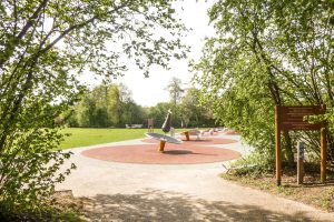 On marche de la grande forêt au bocage en passant par les vignes et les bords du lac « façon ville nouvelle ». Le parti est un peu kitsch mais la réalisation très réussie. Les « paysages type » [l’expression est de Corajoud] se développent puissamment et permettent vraiment d’oublier un peu l’environnement de Villepinte.