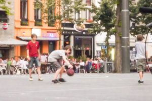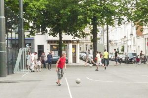 Dans le rectangle intérieur, un enrobé avec un terrain de foot tracé au sol qui accueille des matchs, traversé par les skateurs et les patinettes.