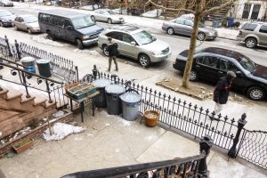 À Bedford Stuyvesant, la barrière enserre l’ensemble de l’espace de devant et met à distance les premières marches.