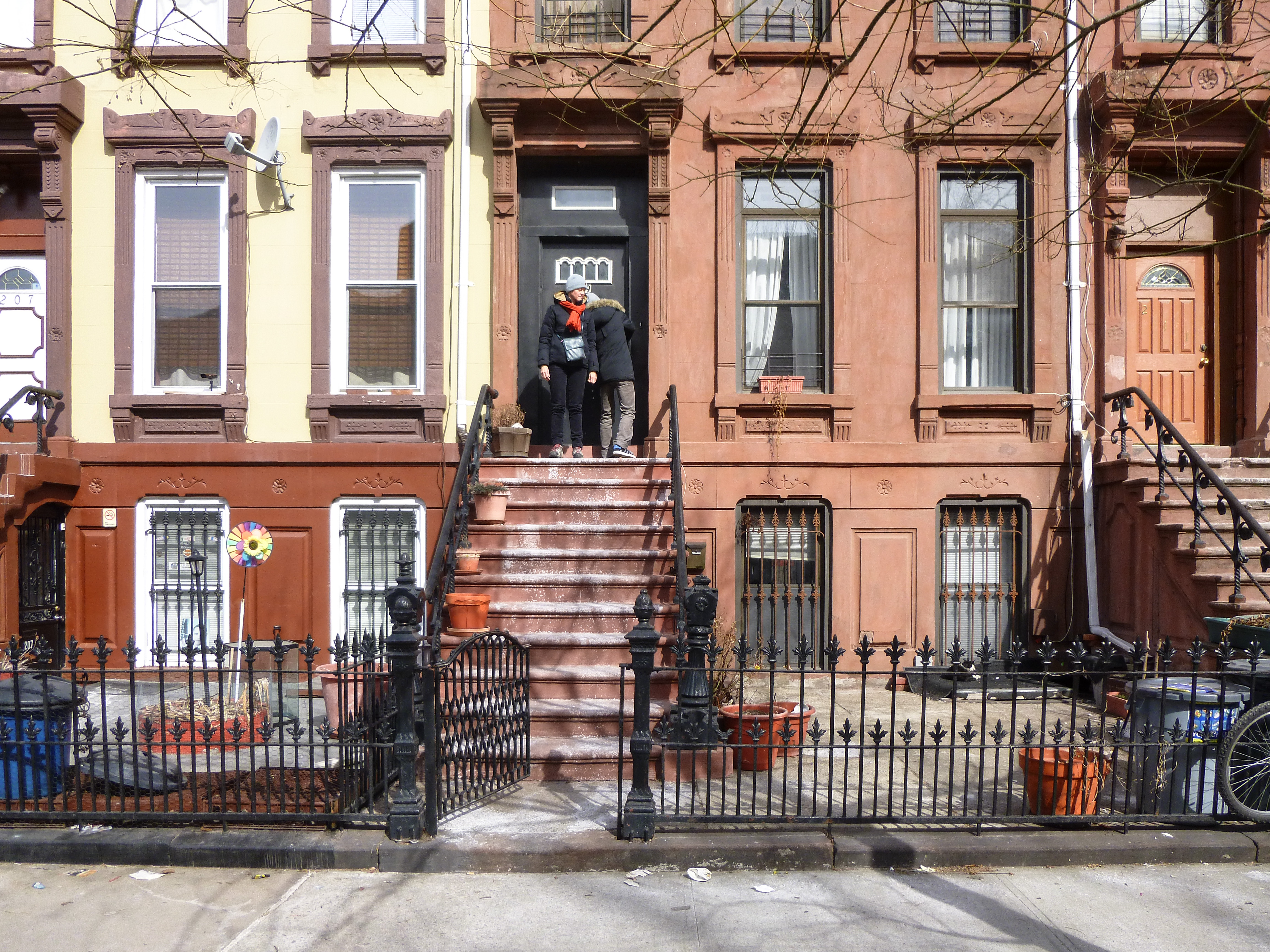 À Bedford Stuyvesant, la barrière enserre l’ensemble de l’espace de devant et met à distance les premières marches.