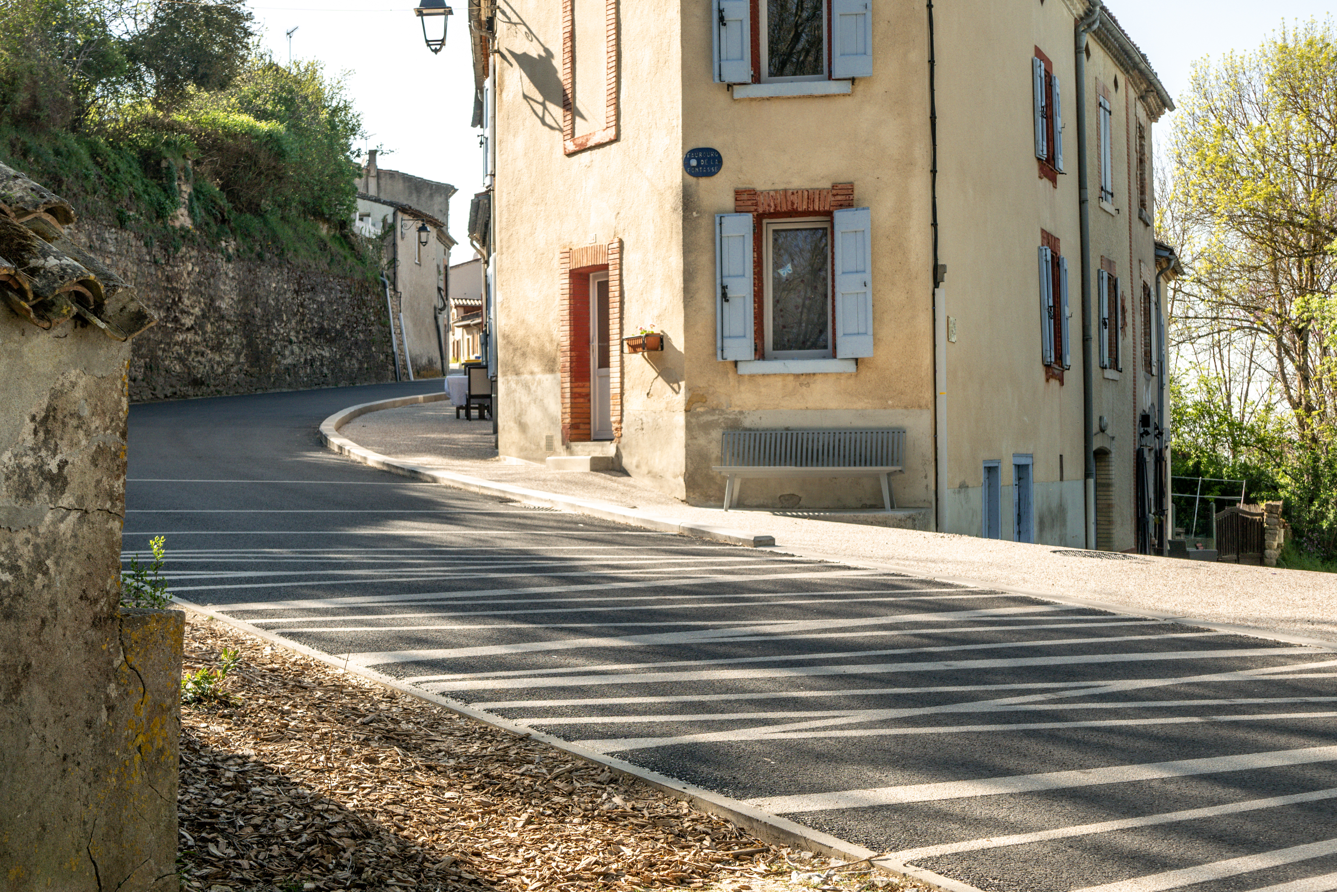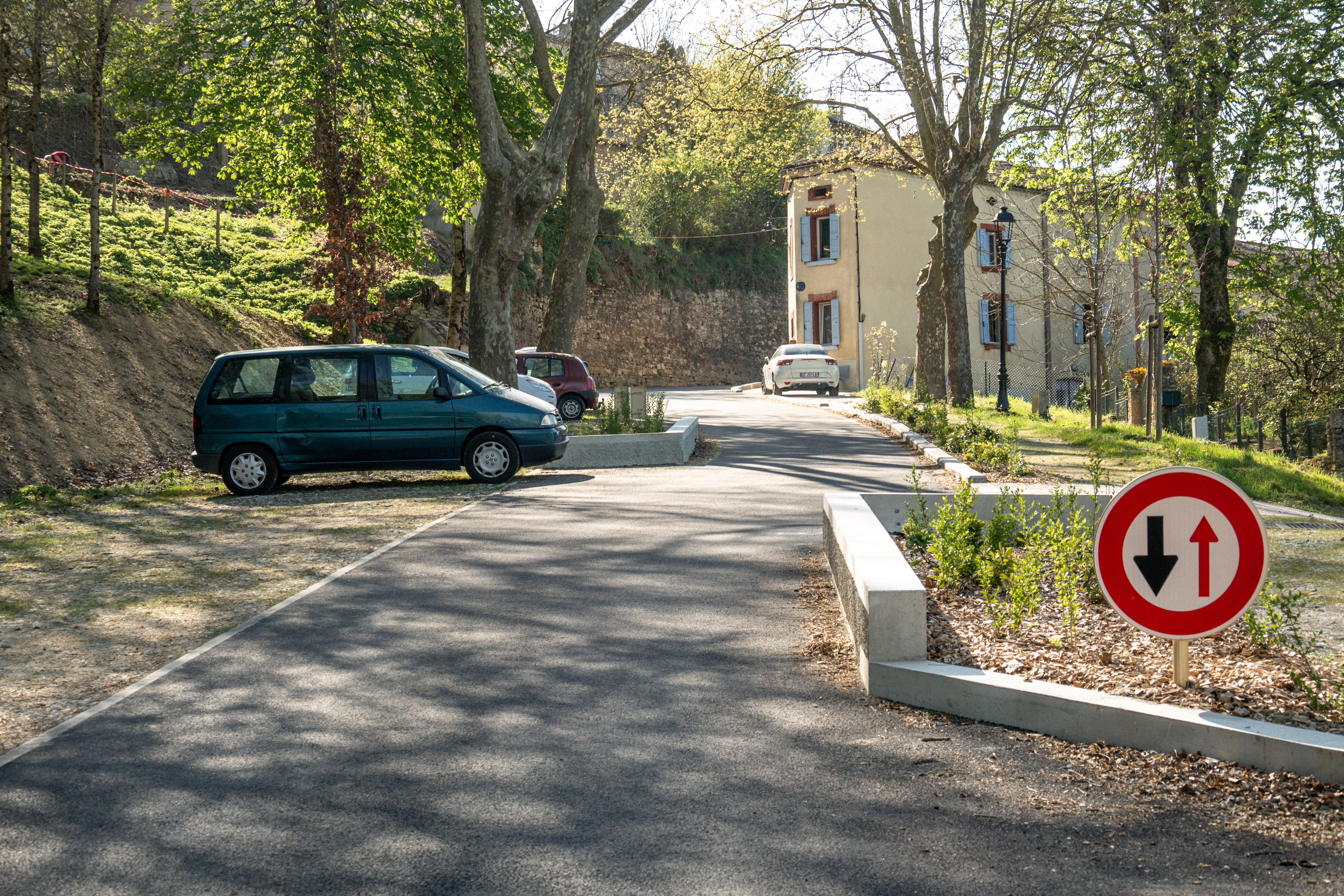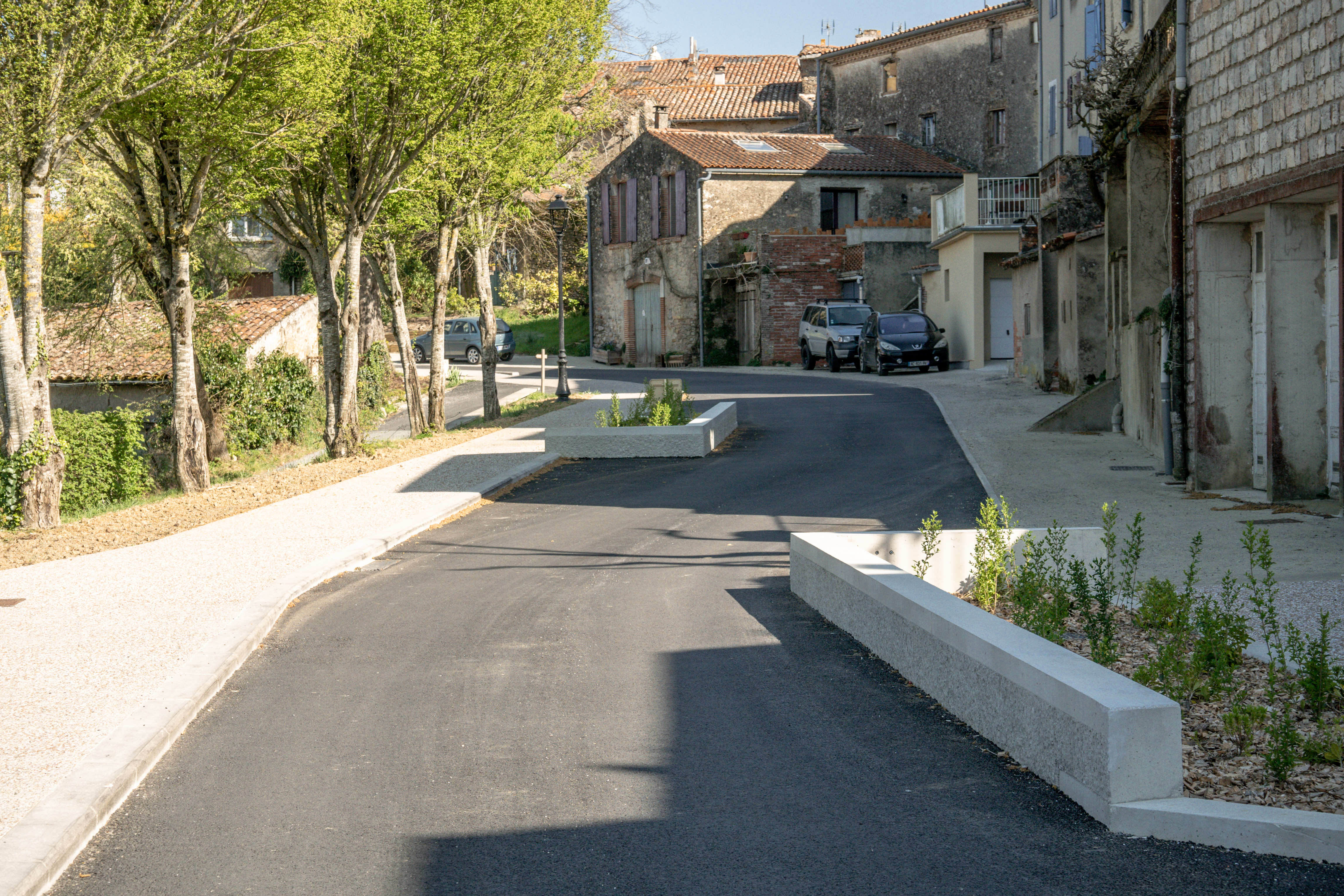 Au contact de la voirie le projet propose l’installation d’une bordure en béton (effet pierre reconstituée). La vue varie coté habitation et la partie Sud est réservée au stationnement riverain avec un revêtement en grave naturelle.