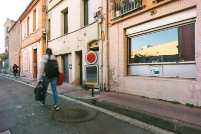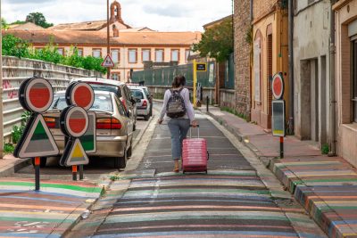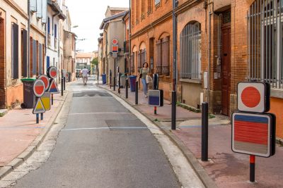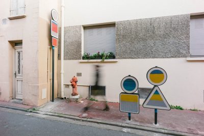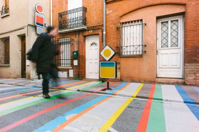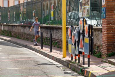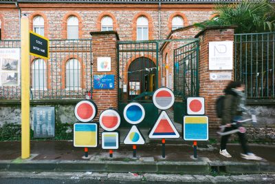 Le choix s’est porté sur la rue Sainte Catherine, petite rue de faubourg, trop passante au goût des habitants et des parents d’élèves de l’école Notre Dame. La moitié de la rue devant patienter pour la fin d’un gros chantier de construction, cela justifiait encore plus le caractère provisoire de l’aménagement. Les services se préparaient à déployer la panoplie « low cost » habituelle dans les quartiers hors du centre : dos d’âne en enrobé avec faux pavés en résine, peinture au sol et signalétique fonctionnelle pour annoncer « zone 20 », etc. Que faire avec ce tout petit budget pour que cet aménagement, aussi provisoire soit-il, fasse projet pour autant ? La rue était saturée de panneaux de signalisation et l’école signalée par des poteaux de couleurs primaires issu d’un catalogue standardisé. L’idée nous est venue de jouer de ces éléments en les « décalant » légèrement ! Sophie Balas, plasticienne, a proposé alors un jeu de lignes de couleurs au rythme dense mais irrégulier pour signifier les zones de ralentissement. Les panneaux ont été repris et même multipliés et combinés par deux ou trois pour créer des formes évoquant tous une sortie d’école. Sophie les a détournés en faisant de chaque panneau un tableau abstrait et coloré. Ce petit kit de l’aménagement provisoire a eu un tel succès que les panneaux ont été dérobés le jour de la pose ! Beaucoup s’interrogeaient sur le sens de l’intervention. S’agissait-il d’une